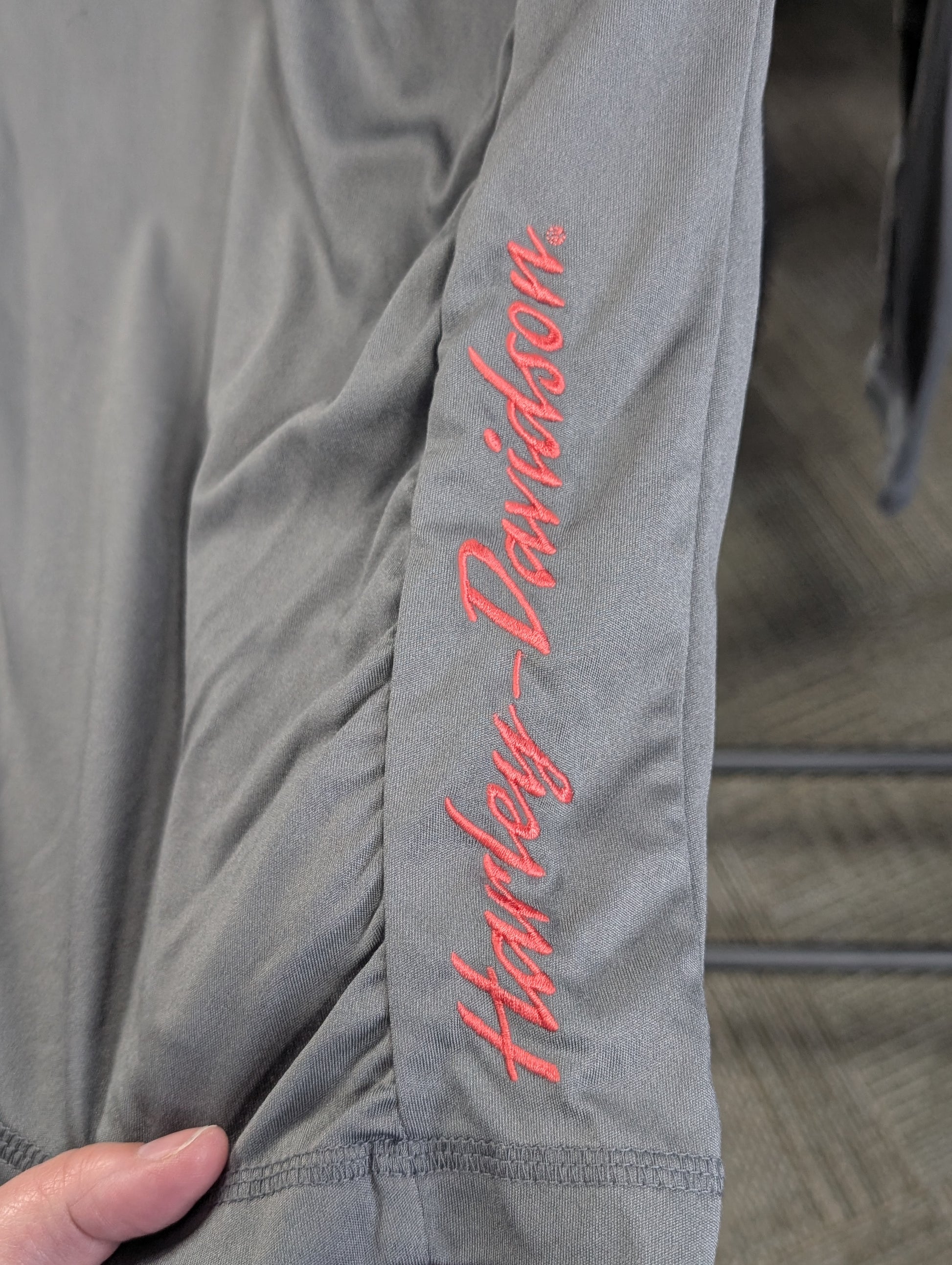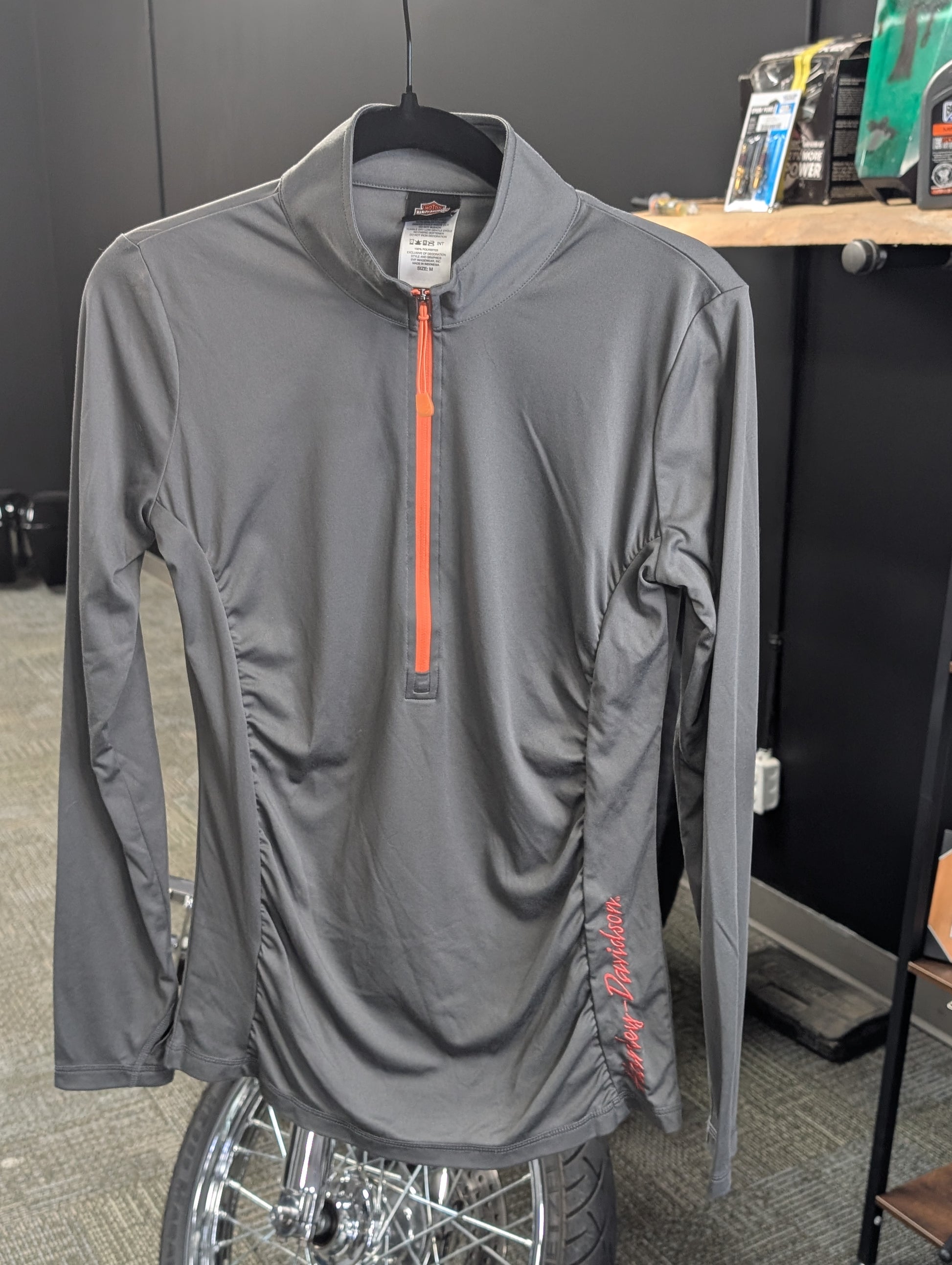Stay stylish and comfortable with this Women's Medium Harley-Davidson 1/2 Zip Pullover. Made of 100% polyester, this pullover features a collared neckline and long sleeves for a classic look. The gray color and 1/4 zip closure add to its casual yet chic style, perfect for everyday wear or motorcycle activities. With UV protection and the iconic Harley-Davidson brand, this pullover is a must-have addition to any wardrobe.