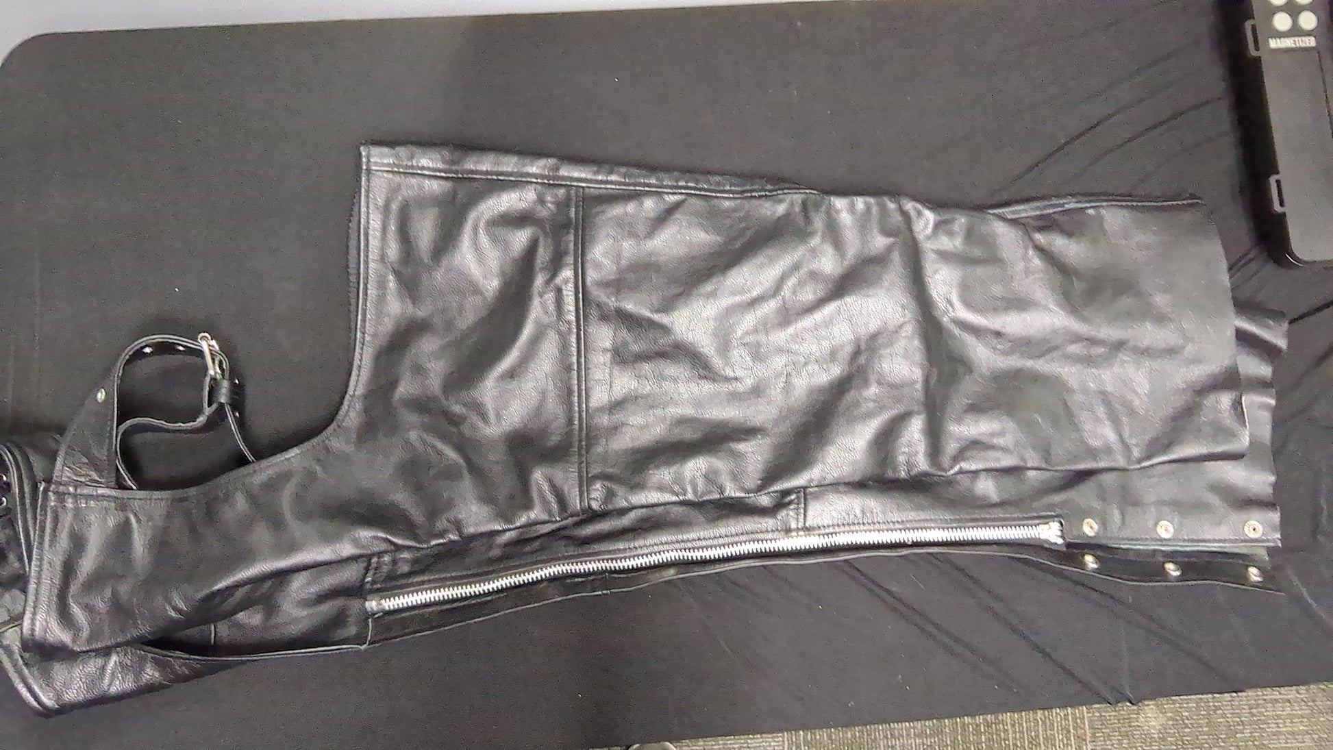 Classic black leather motorcycle chaps — durable, heavy, and built for the ride.