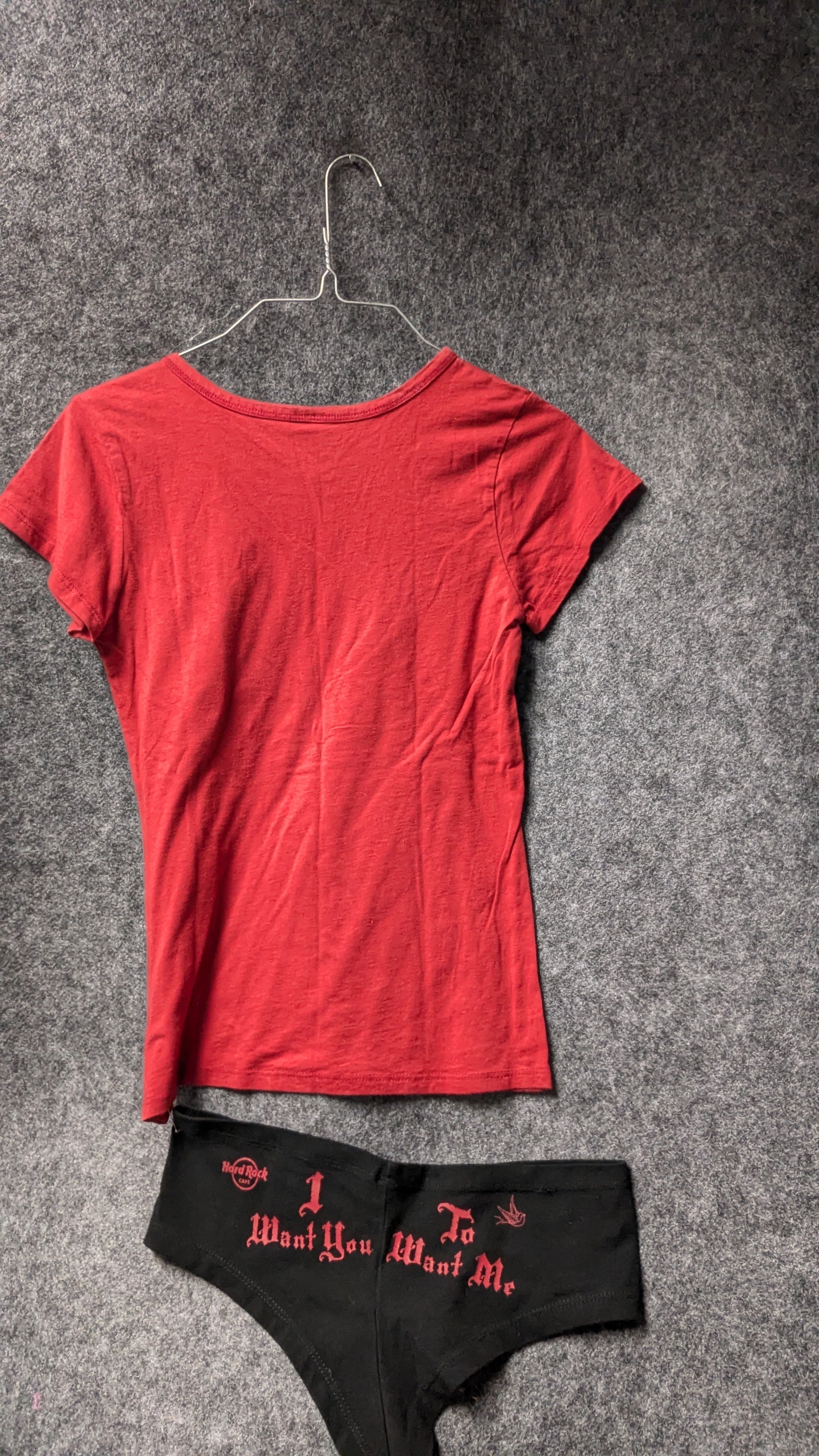 Bring some rock-and-roll attitude to your wardrobe with this matching Hard Rock set. The fitted red tee features bold gothic lettering, detailed graphic accents, and the iconic “I Want You to Want Me” design across the front. Paired with black Hard Rock briefs showcasing matching red script on both the front and back, this set is equal parts edgy and fun.