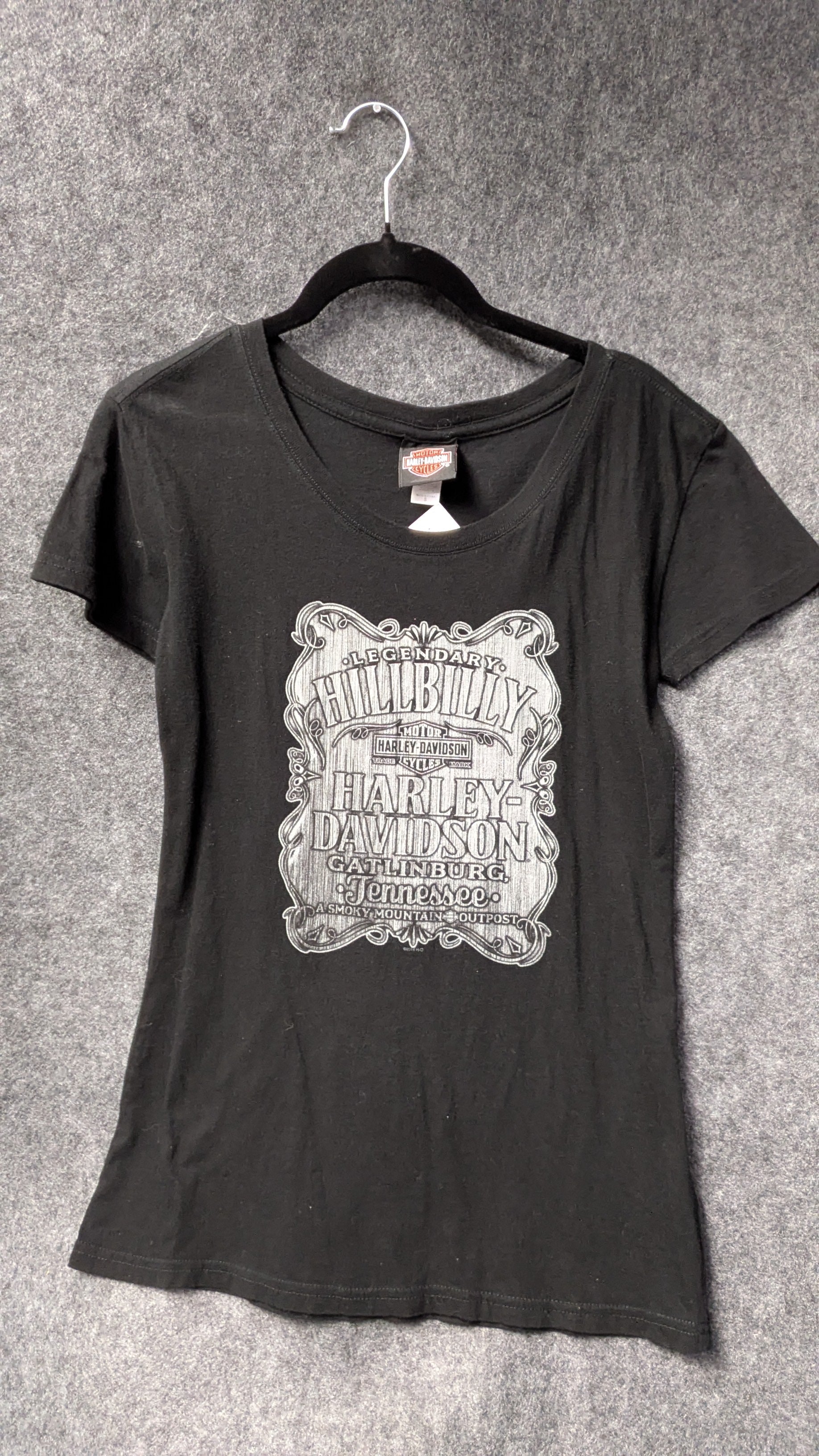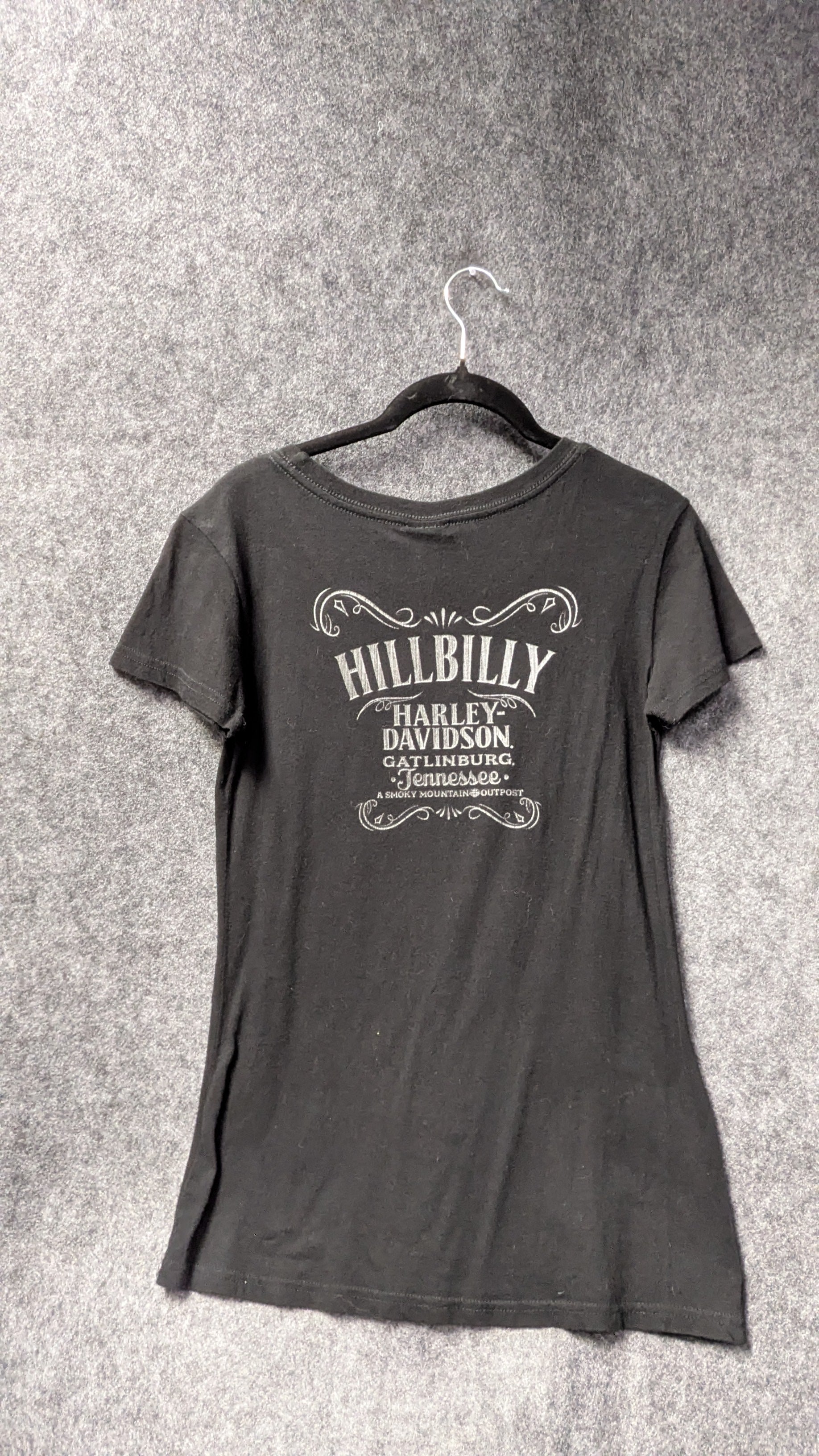 Women’s Harley-Davidson Hillbilly tee from the Gatlinburg, Tennessee Smoky Mountain outpost. Classic black with a distressed vintage-style front and back print. Soft, lightweight, and perfect for layering or everyday wear.