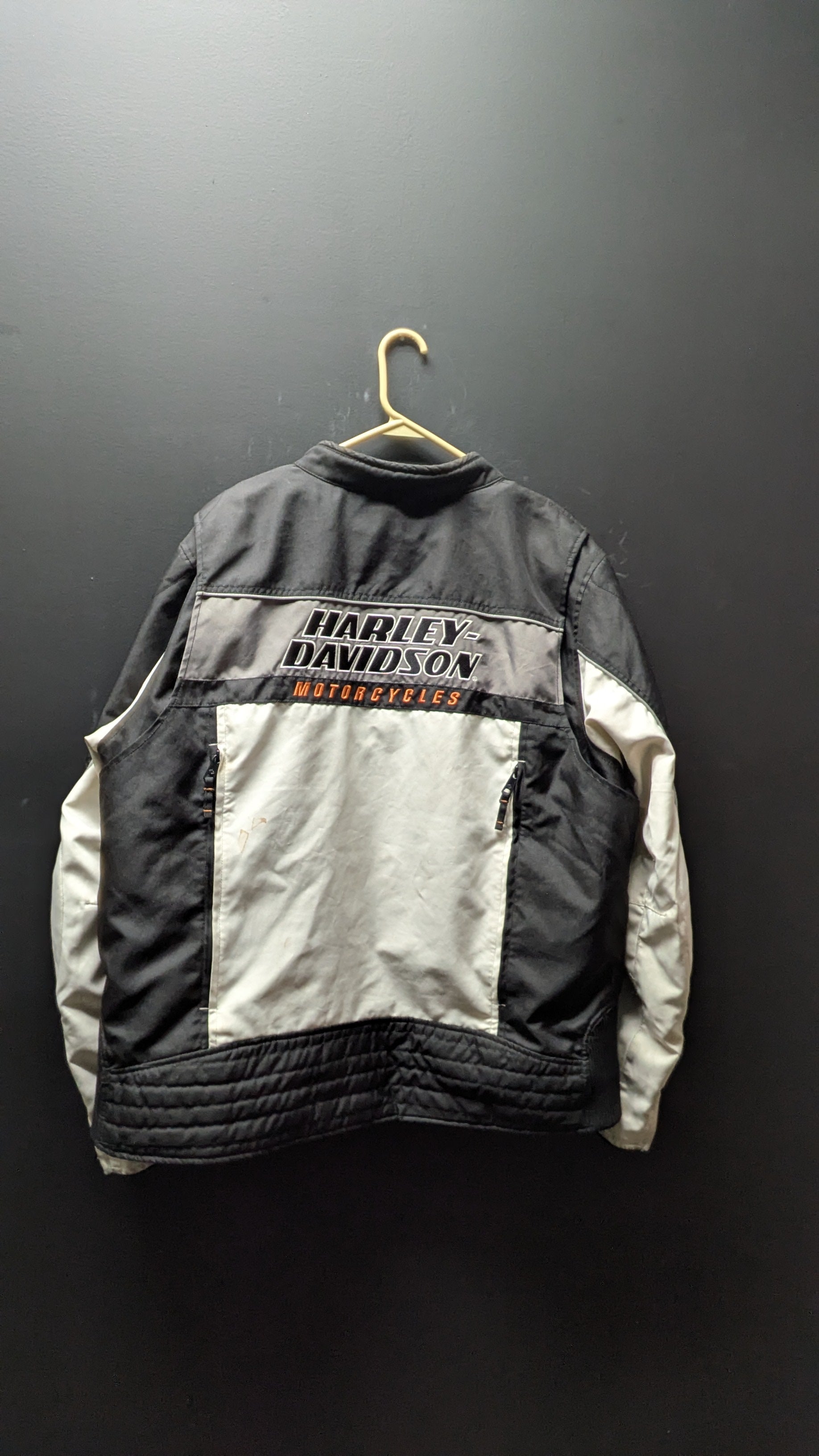 Authentic Harley-Davidson riding jacket featuring a bold black, gray, and cream color-block design with classic orange accents. This jacket delivers both style and function, perfect for riding or everyday wear.