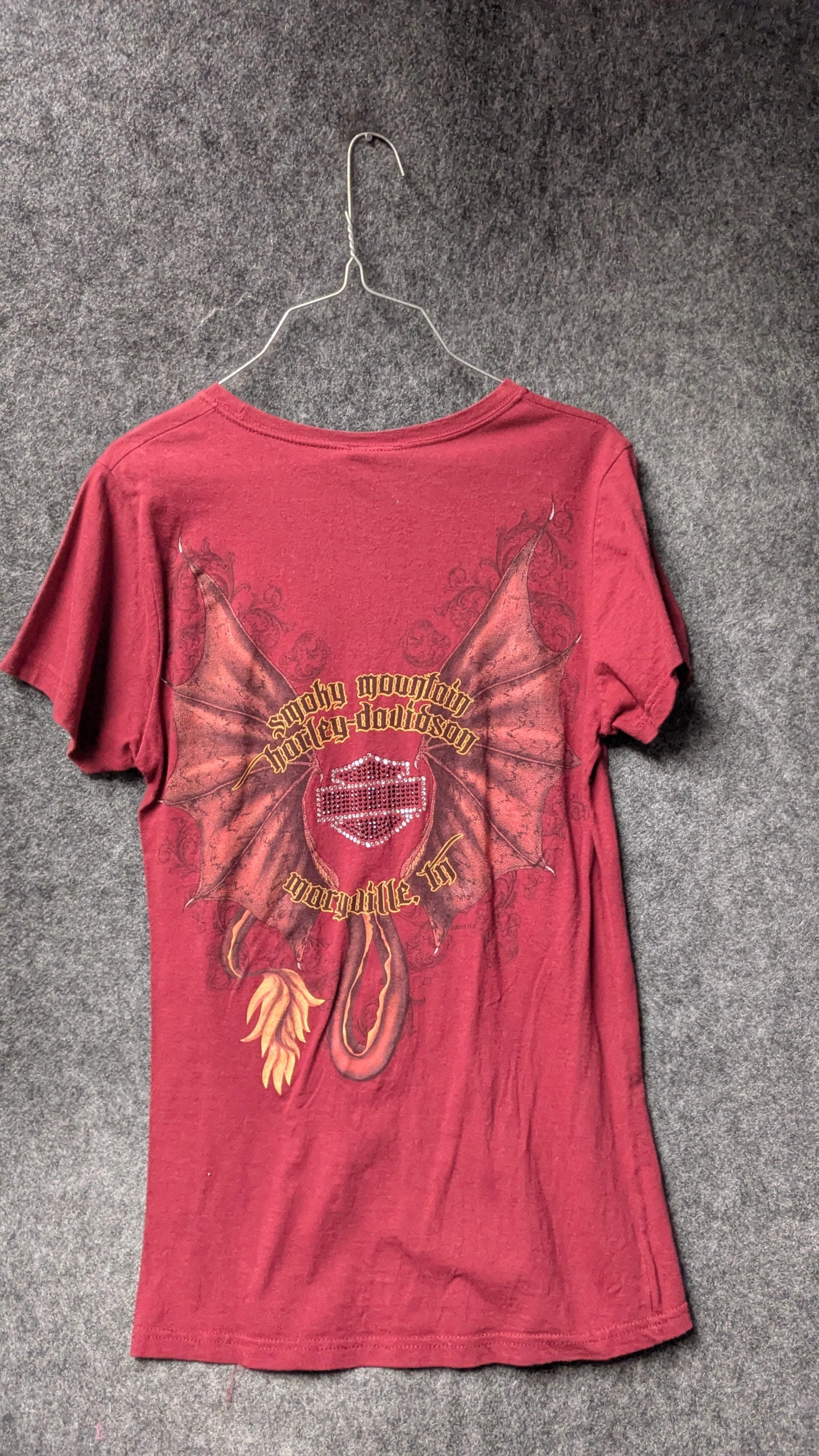 The back showcases dramatic dragon wings, ornate detailing, and a rhinestone-accented Harley-Davidson Bar & Shield graphic. The Smoky Mountain Harley-Davidson – Maryville, TN dealer print makes it a collectible piece for riders who know and love the famous Dragon route.