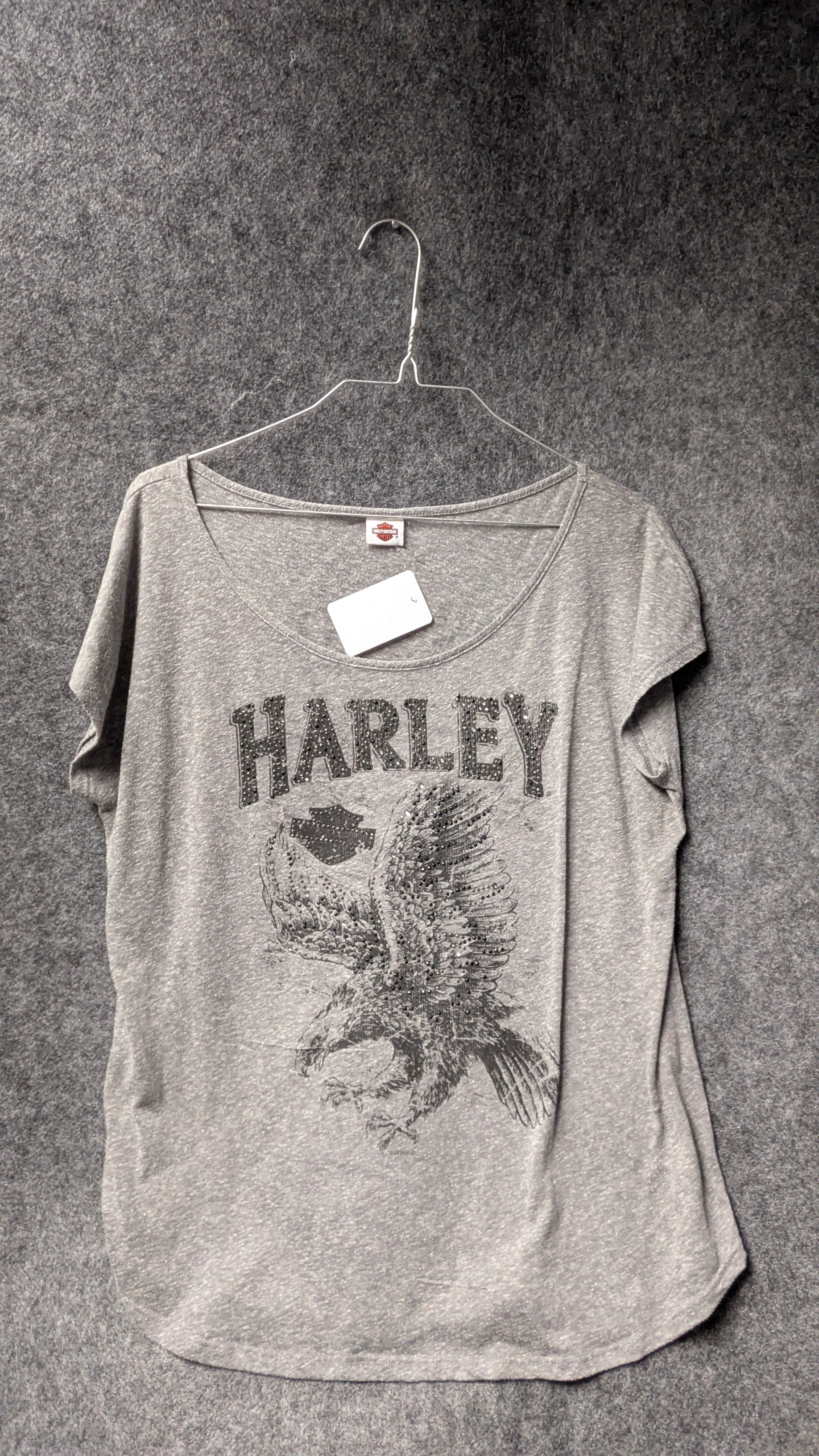 Soft, stylish, and effortlessly classic—this women’s Harley-Davidson tee features a vintage-inspired design with a relaxed fit and beautiful graphic details. The front showcases a distressed HARLEY print paired with a bold flying eagle graphic, giving it that iconic biker attitude. Subtle rhinestone-style accents add a touch of sparkle without overpowering the design.