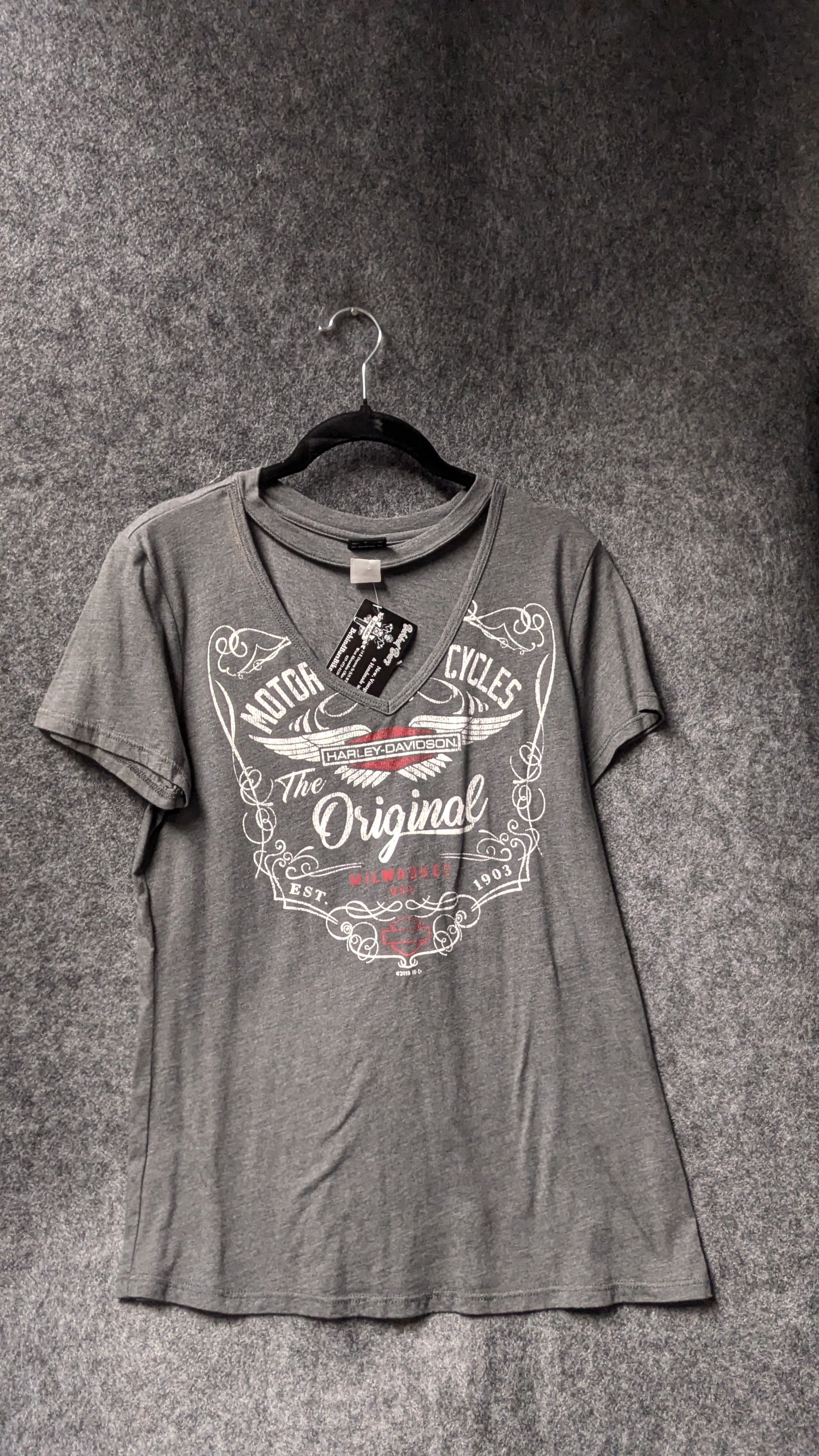 A soft, stylish classic for any Harley lover—this women’s Harley-Davidson v-neck tee combines vintage-inspired graphics with the comfort of a laid-back everyday shirt. The front features a beautifully detailed “The Original – Harley-Davidson Motorcycles” graphic with winged accents, scrollwork, and a distressed finish for that authentic retro look.
