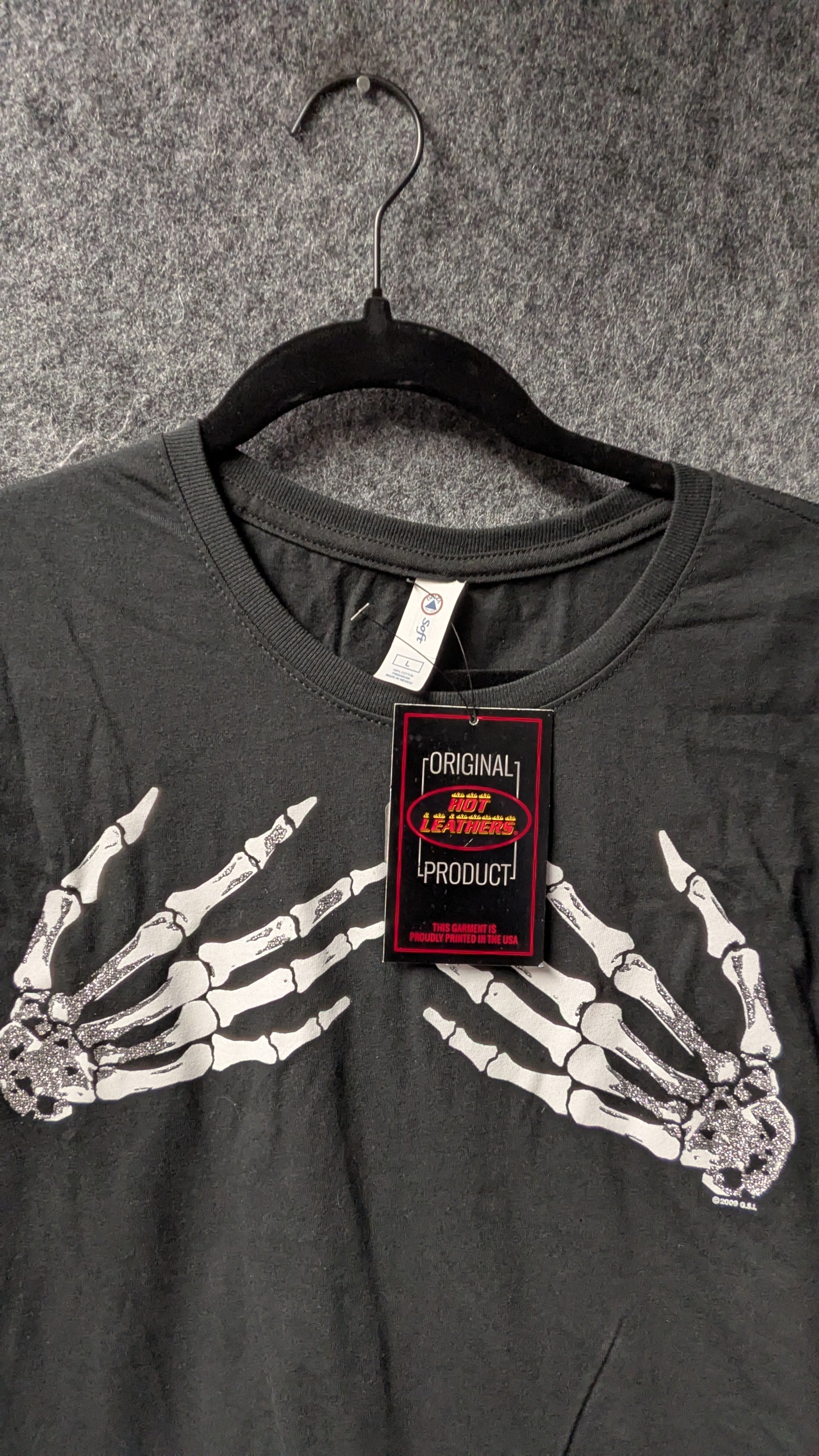 Bold skeleton-hands graphic — clean lines, high-contrast design that plays perfectly with dark denim, black leather, or biker boots.