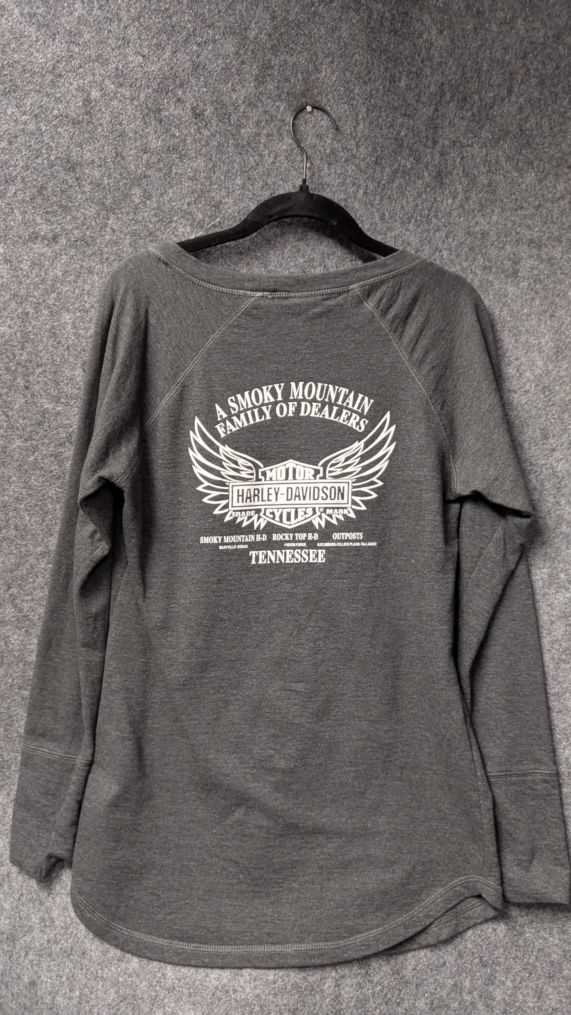 The front features a gorgeous Harley-Davidson script graphic in teal, white, and red for a retro-inspired look. The back showcases a large dealer print from Smoky Mountain Harley-Davidson – Tennessee, complete with bold wings and multiple dealer locations—making this a great collectible piece.