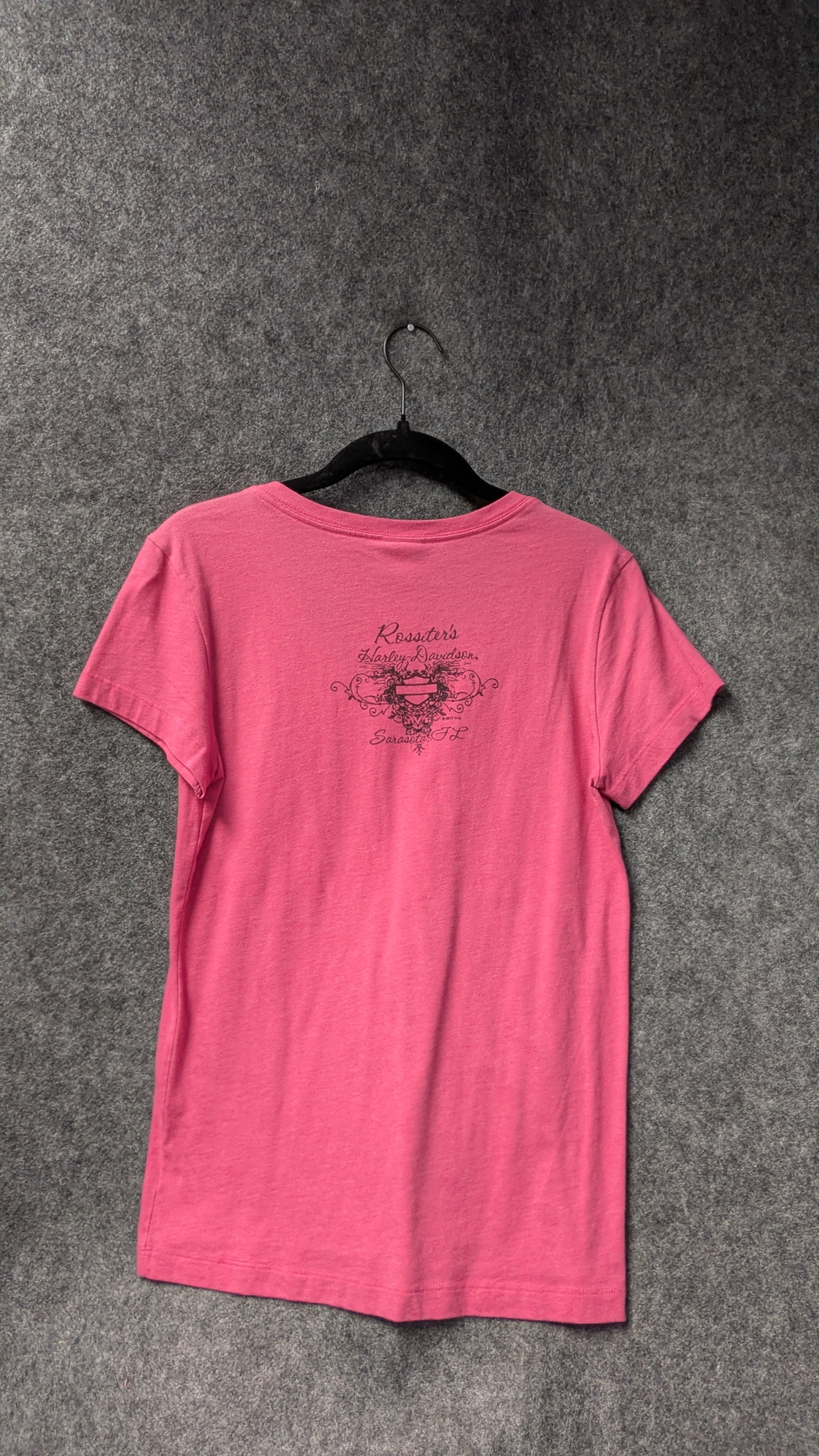 Cute, soft, and perfect for everyday wear — this Harley-Davidson women’s v-neck tee features a bold script “Harley” graphic on the front and a dealership print from Rossiter’s Harley-Davidson in Sarasota, FL on the back. Bright pink color with a flattering cut.